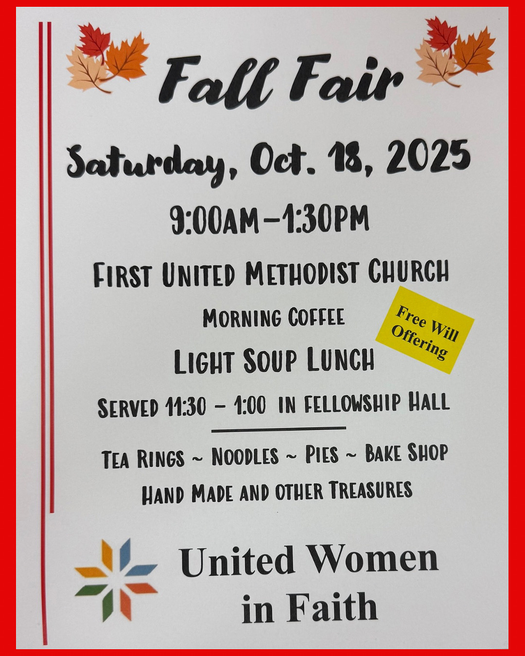 Annual fall fair with homemade tea rings, noodles, pies, and baked goods along with many wonderful handmade treasures. A light soup luncheon will be served from 11:30am-1:00pm for a free will offering. All proceeds go to support local and global missions.