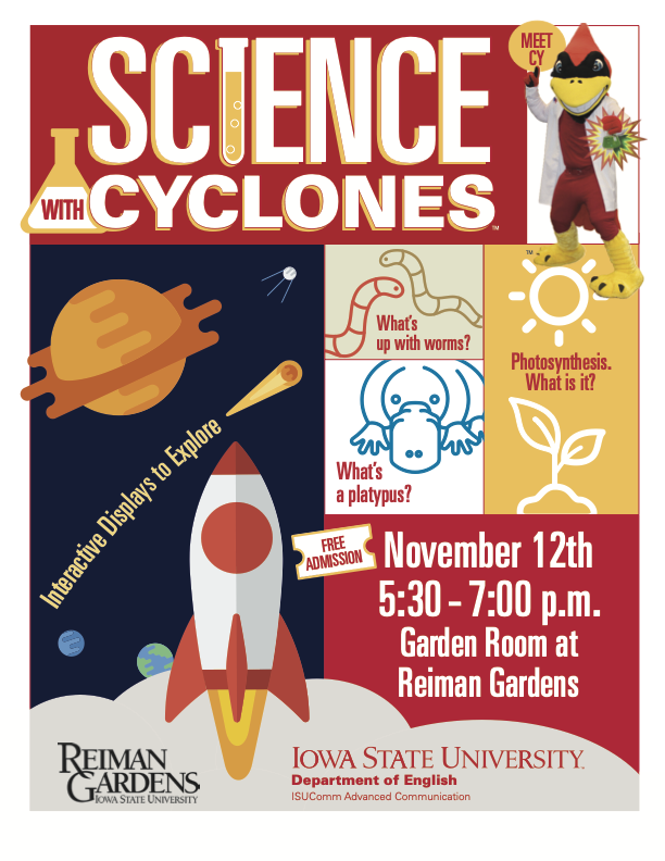 Science with Cyclones is inspired by a famous program at The Alan Alda Center for Communicating Science at Stony Brook University-called the Flame Challenge-in which scientists craft engaging explanations of everyday, yet complex, scientific concepts that can draw in a young audience (for example, explaining what a flame is). Similarly, Science with Cyclones has science students from Iowa State University explaining concepts like ‘why boats float,’ ‘how lightening works,’ and ‘what’s a blood type’ with twenty interactive displays to explore.