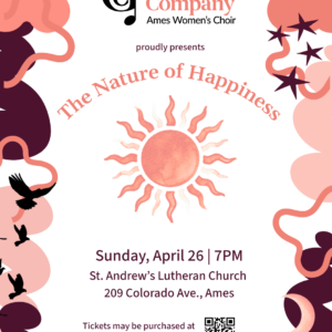 7:00 pmGood Company: Ames Women’s Choir presents “The Nature of Happiness” Spring Concert 209 Colorado Ave., Ames